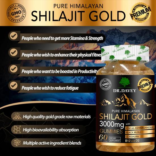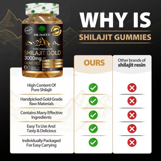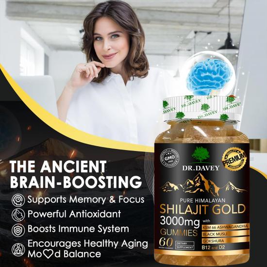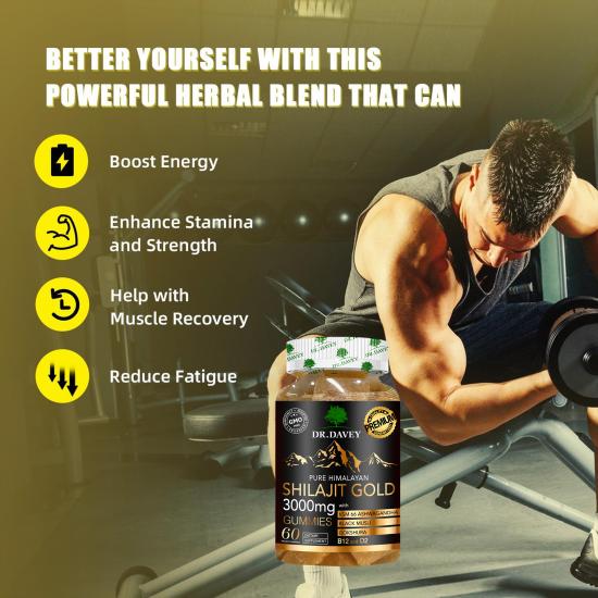 这款 DR.DAVEY 软糖(每瓶 60 粒)含有 3000 毫克纯喜马拉雅山脉的 Shilajit(黄金级原料),以及 KSM-66 南非醉茄、黑麦片、蒺藜、维生素 B12 和维生素 D2。作为膳食补充剂,它们旨在提升能量、增强体力和耐力、促进肌肉恢复、缓解疲劳并改善认知功能(记忆力/注意力)。这款纯素、非转基因配方还具有抗氧化功效、增强免疫力和平衡情绪的作用,适合追求健康和提升体能的人士。