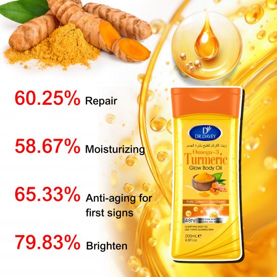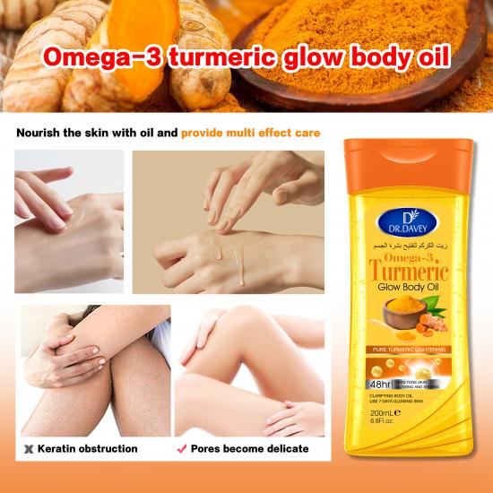Omega-3 姜黄亮肤身体油融合了优质 Omega-3 和天然姜黄提取物,深层滋养干燥肌肤,锁住持久水分,有效提升肌肤光泽,均匀肤色,不油腻,快速吸收,支持定制,批发起订量灵活,适用于日常身体护理。