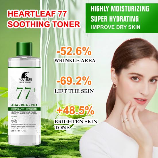 这款238毫升的ROUSHUN爽肤水融合了心叶提取物、AHA/BHA/PHA和透明质酸,专为各种肤质设计,是一款日常舒缓肌肤的佳品。它针对肌肤缺水(80%肌肤问题的根源),保湿率高达99.9%,同时有效减少皱纹(减少52.6%)、提拉紧致(提升69.2%)和提亮肤色(提亮48.5%)。此外,它还能控油、淡化泛黄、改善干燥紧绷的肌肤,带来清爽水润的感受,令肌肤水润柔滑。