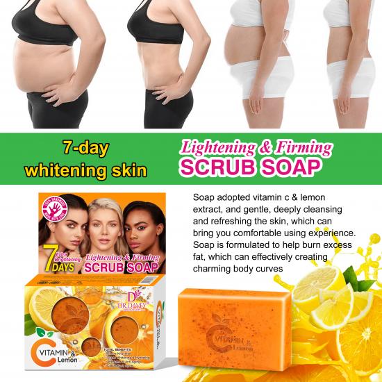 这款磨砂皂富含维生素C和柠檬提取物,用途广泛(可用于清洁、沐浴、洗手和洗发)。它宣称具有7天美白提亮肤色、深层清洁减少痤疮以及紧致燃脂配方,帮助塑造身体曲线。温和清爽的质地清洁滋养肌肤,旨在恢复娇嫩肤色,同时帮助塑造身体轮廓。
